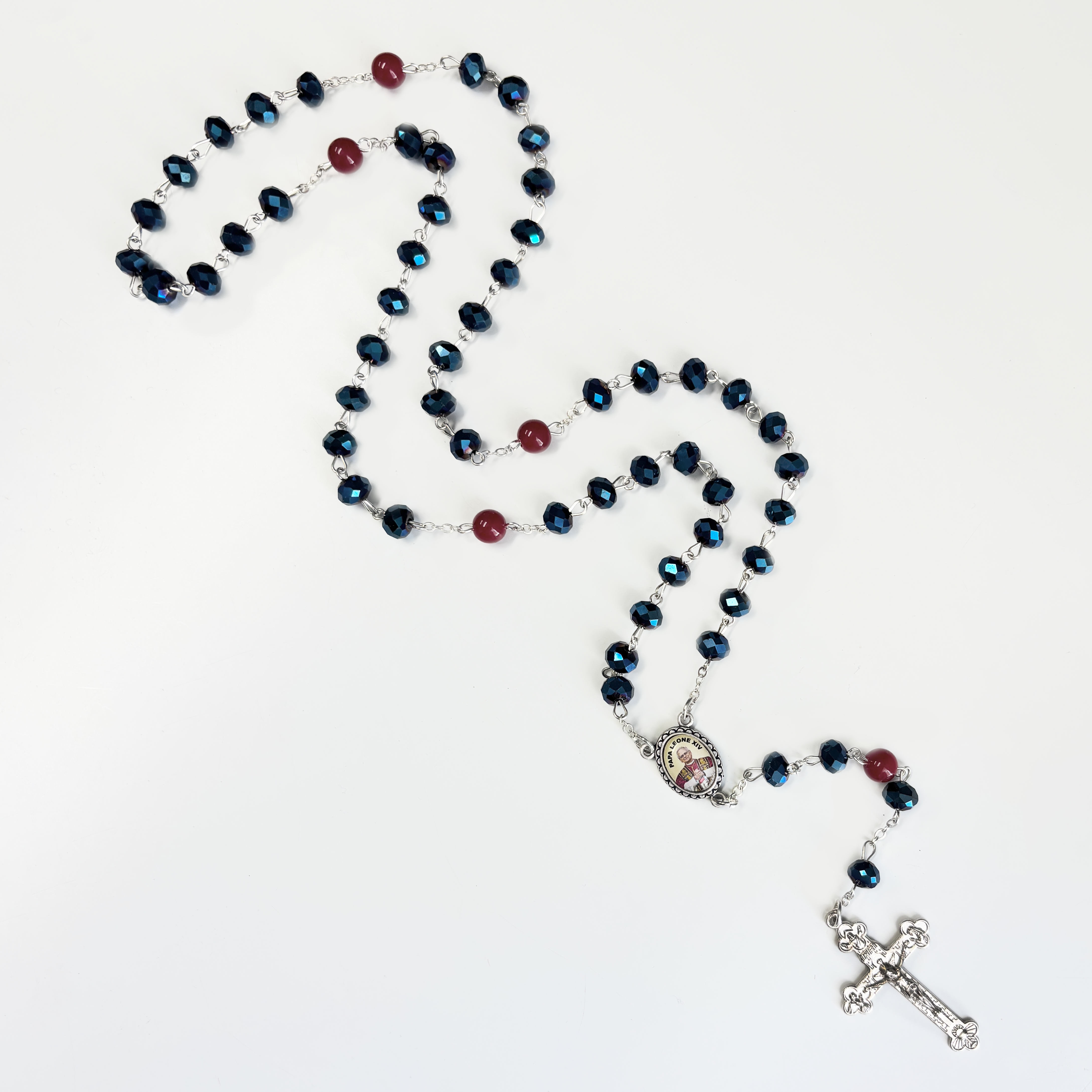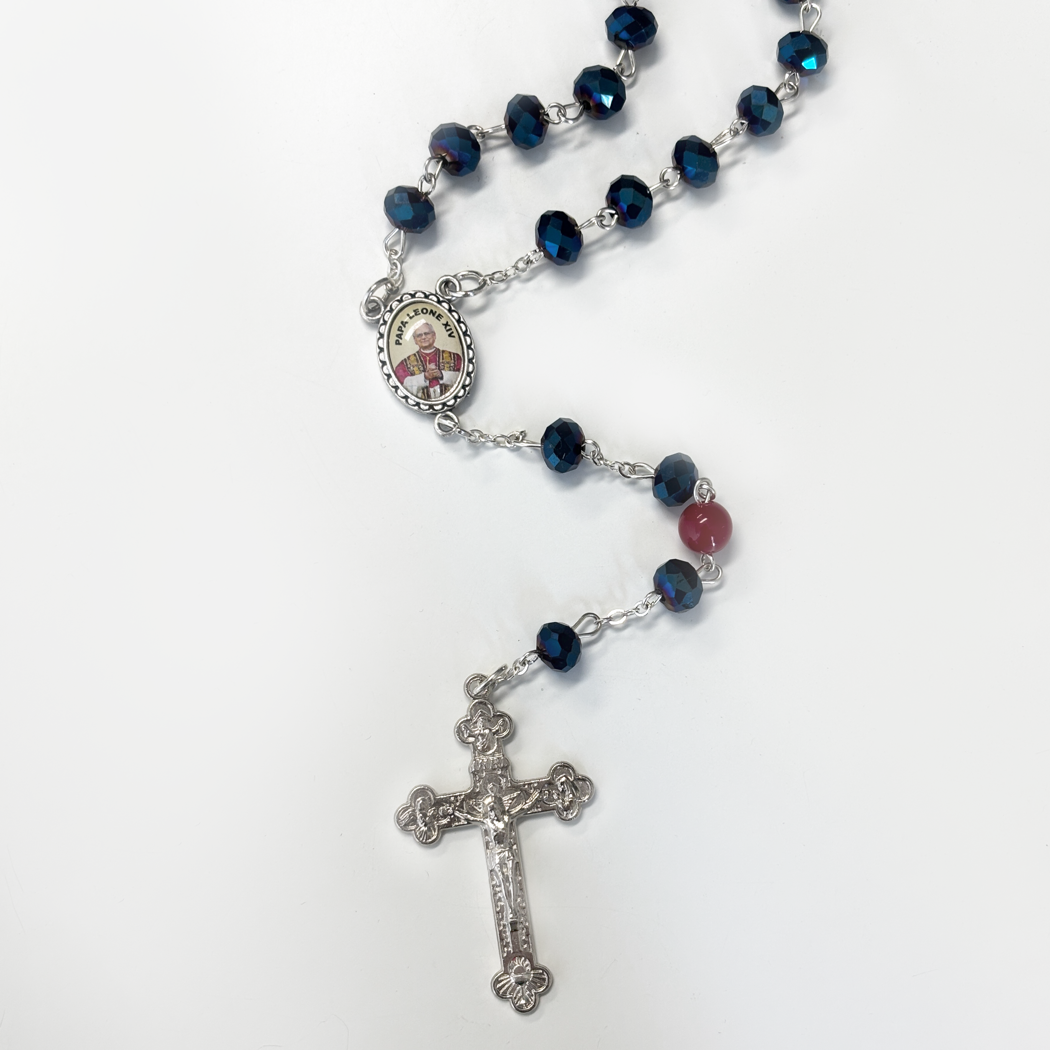 Rosario de forma elegante con cuentas de cristal azul y medalla con la imagen del Papa León XIV. Perfecto para la oración o como regalo espiritual.