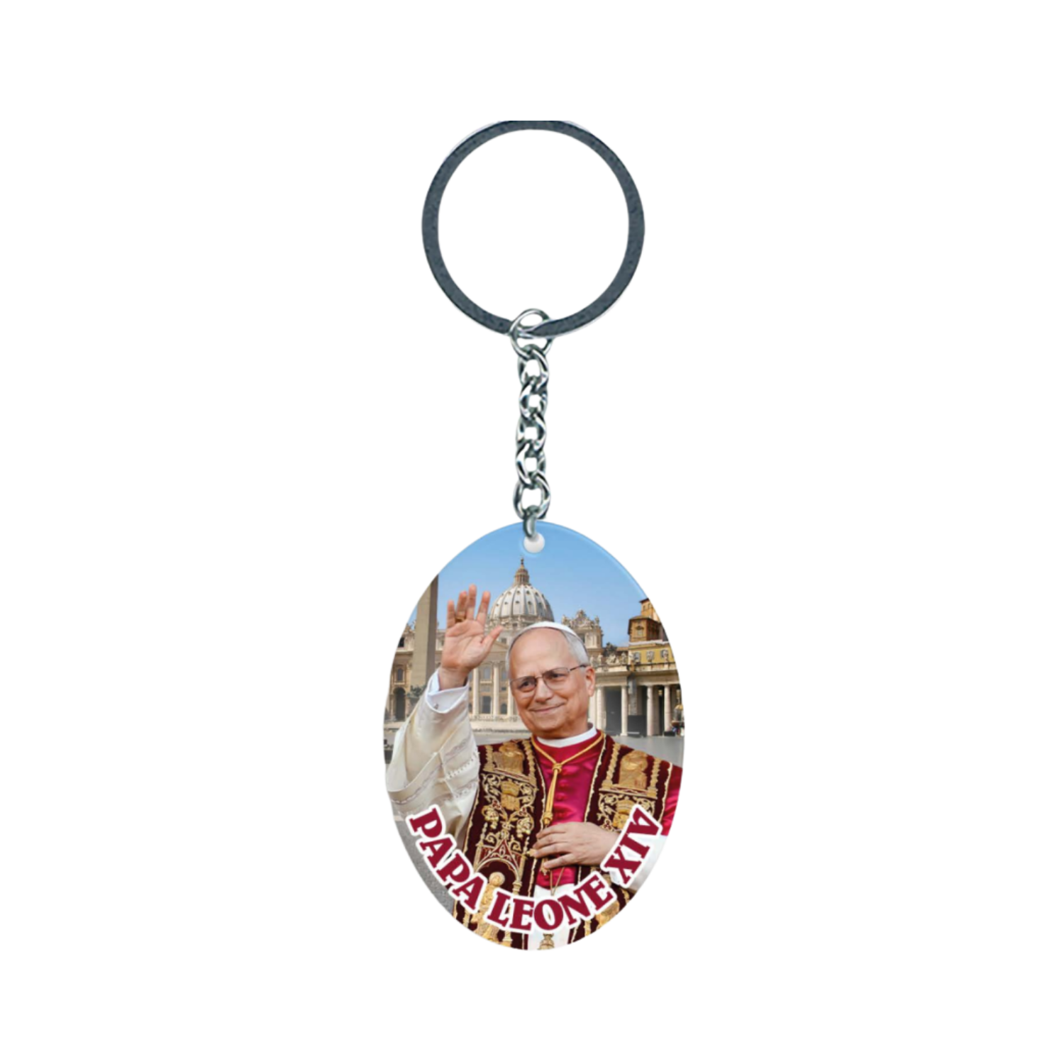Llavero ovalado con imagen del Papa León XIV. Hecho de polímero resistente y metal pulido, es un accesorio espiritual y un regalo especial.