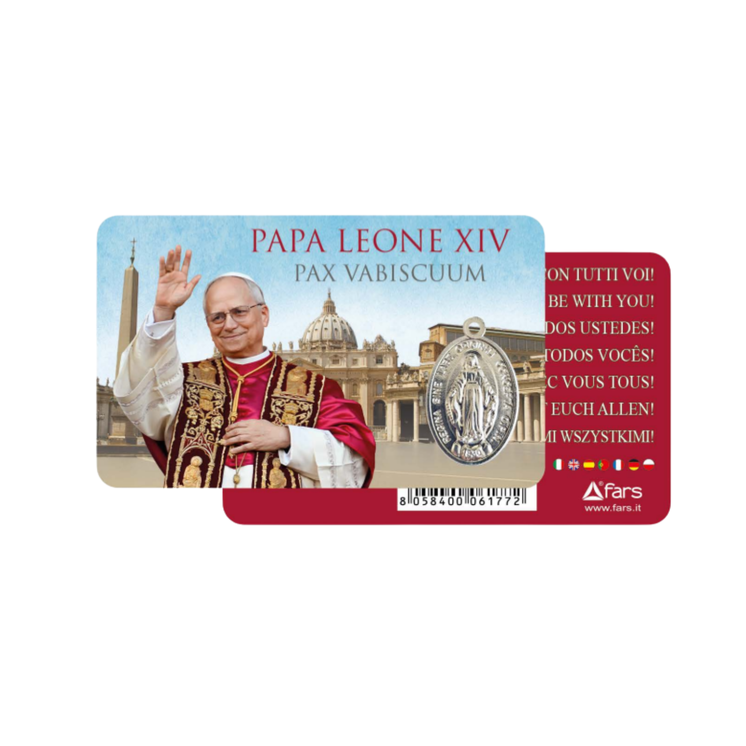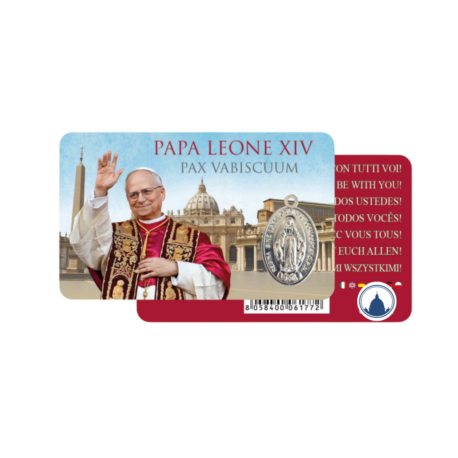 Estampa de oración de bolsillo con la imagen del Papa León XIV y una pequeña Medalla Milagrosa metálica. Mide 8,6 x 5,4 cm: perfecta para llevar en la cartera o regalar como signo de fe.
