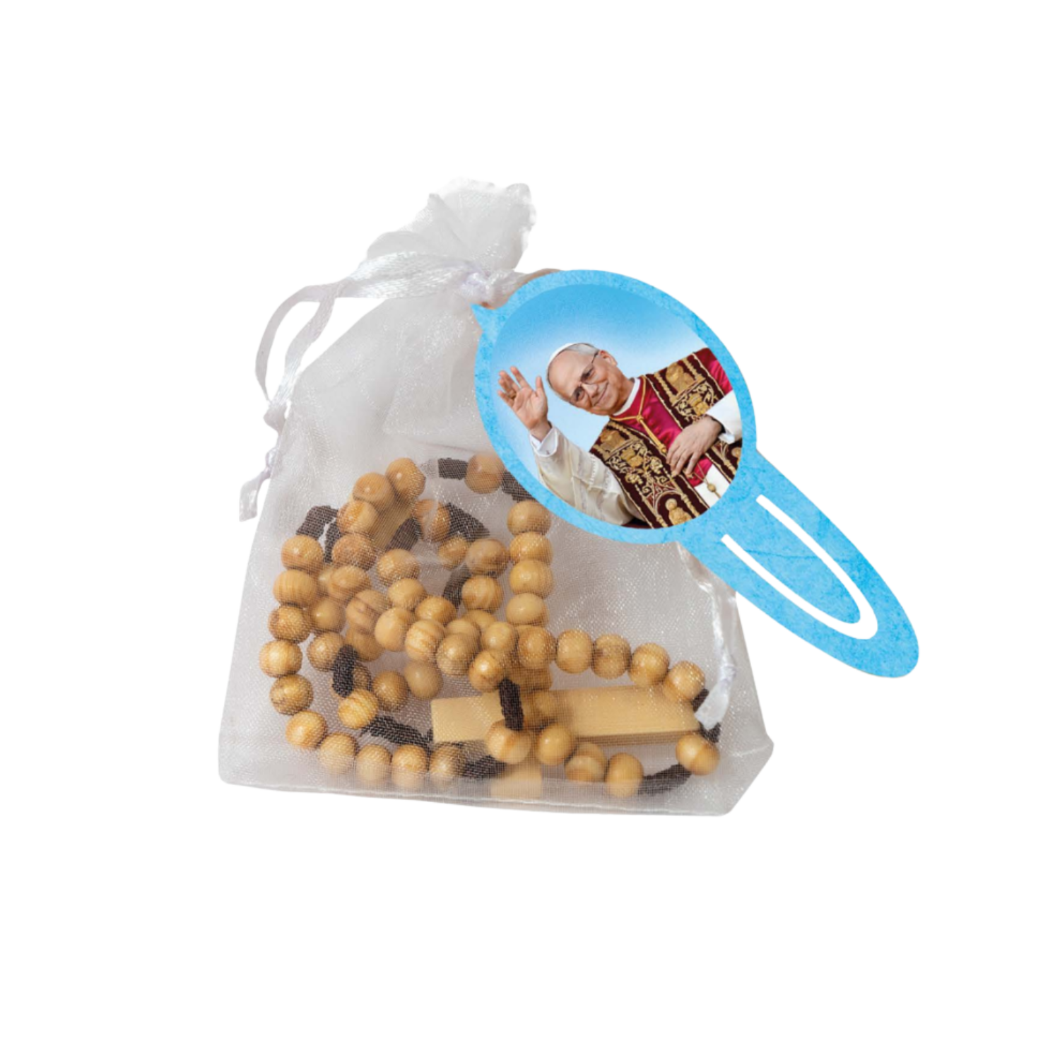 Bolsita de tul con un pequeño marcapáginas con la imagen del Papa León XIV y un rosario de madera con acabado efecto olivo. Un detalle con valor espiritual, ideal para regalar o conmemorar.